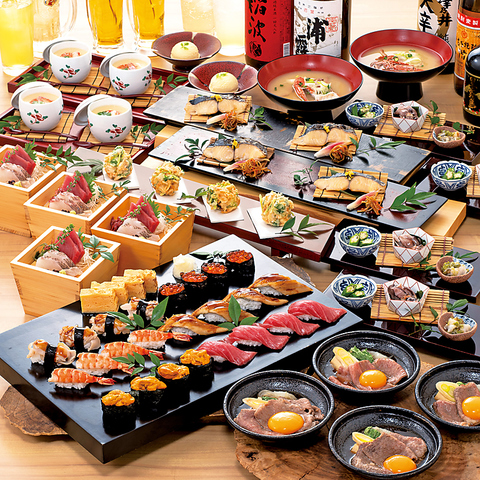 魚介出汁がきいた茶碗蒸し・握り寿司盛り合わせ・和牛すき焼き鉢など「多彩な寿司をはじめ、豪華逸品が目白押し」落ち着いた空間で、ご親族やご友人、大切な方々とのご宴会にふさわしい時間をご提供いたします。ご注意)ご予約の時期により、仕入れの関係上料理内容が変更になる場合があります。