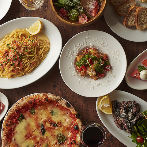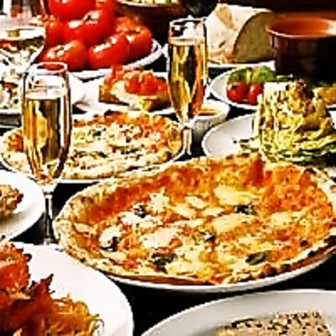 各種宴会にぴったりな内容で、特に女子会や歓送迎会に大人気◎お食事重視かデザート重視か、お客様の好みに合わせて選べるのが嬉しいポイント。ボリューム満点の前菜や、リアナ自慢のピッツァ、そして甘さ控えめのデザートが揃い心ゆくまで楽しむことができます。お酒と一緒に楽しむ料理の数々はどれも見た目も華やかです。