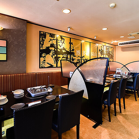 博多名物もつ鍋を気取らず楽しんで頂けるテーブル席は、本店の2階!壁面は山笠の勇壮な絵で博多らしさを演出しています。桜ユッケや博多焼ぎょうざなどのメニューもご用意!