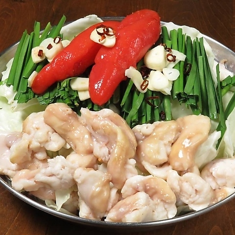 当店自慢の一品。博多名物もつ鍋に明太子をトッピング。新鮮な国産牛もつを使用した醤油ベースのもつ鍋です。県外からのお客様からも大好評。締めのちゃんぽん麺がこれまた最高!!!