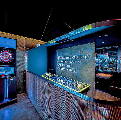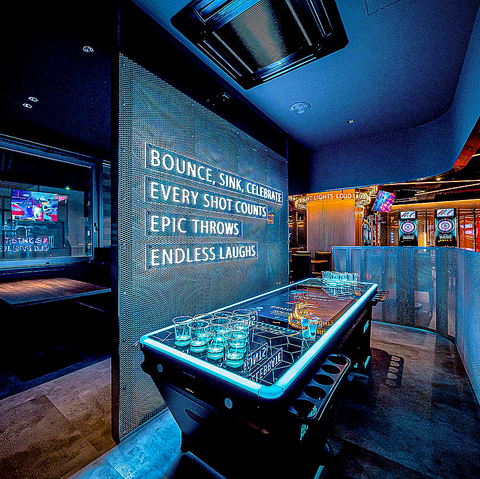 ハイポンを大迫力の演出でプレイできる「ハイポン」!ビアポンとは、水やビールが入ったカップを10個ずつ、ボウリングのピンのようにいテーブルの両端に10個ずつ置き、相手側のカップにピンポン玉を投げ合うゲームです。ビアポンは日本ではまだ歴史が浅いゲームですので、ビアポンテーブルを置いているお店はまだあまり多くありません!