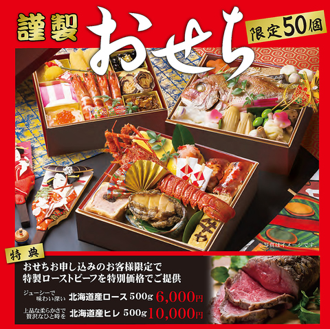 新年を彩る「謹製おせち」を、今年も数量限定でご用意いたします。和食ひと筋五十年の料理長が、熟練の技で仕立てたお重は、素材の味わいが引き立つ自信作。さらにご予約特典として、芳醇な旨みが際立つ特製ローストビーフを特別価格にてご提供いたします。華やかに彩られたおせちとともに、格別の新年をお迎えください。