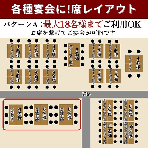 【パターンA】最大18名様までご利用OK!座敷席を繋げることで、最大18名様までご利用可能。座敷席となっておりますので、足を伸ばしてゆったりとおくつろぎいただけます。会社宴会やご親族とのお食事の際にぜひご利用ください。
