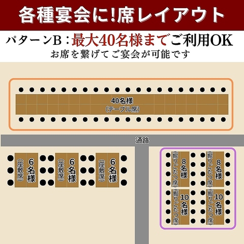 【パターンB】最大40名様までご利用OK!掘りごたつ席、テーブル席のそれぞれを繋げることで、最大40名様までご利用可能。ご利用シーンに応じてどちらかお好きなお席をお選びください。大人数宴会や同窓会、二次会など様々なシーンに最適です。