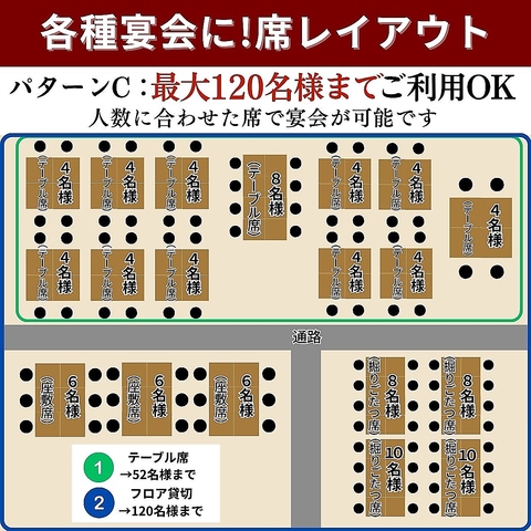 【パターンC】最大120名様までご利用OK!テーブル席を繋げることで、最大52名様までご利用可能。また、フロア貸切の場合は最大120名様までご利用いただけます。会社宴会はもちろん、結婚式の二次会、大規模なパーティーやイベントにも最適です。広々とした空間で、一体感のある時間をお過ごしください。