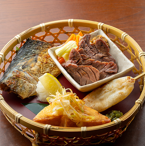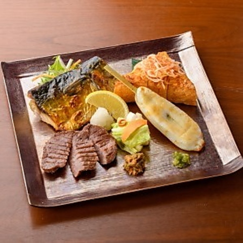 名物料理の厚切り牛たん、金華沖さば、三角油揚げ、笹かまぼこを一皿に盛り合わせました。