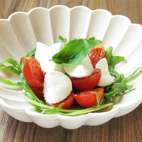 本場ナポリピッツァになくてはならないのが水牛のミルクから作られるモッツァレラチーズ。 希少な水牛ミルク100%のひと口サイズのモッツァレラチーズ「ボッコンチーニ」を毎週空輸しております。濃厚なミルクの味を是非お楽しみ下さい!(写真はカプレーゼ)