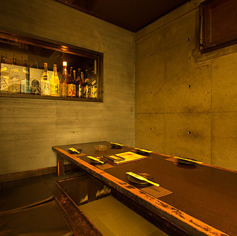 【落ち着いた空間でゆったり寛ぐ】店内は木材とコンクリート壁を組み合わせた、モダンで落ち着いた雰囲気◎掘りごたつ式テーブル席をご用意。足を伸ばしてゆったりとお寛ぎいただけます。柔らかな光が空間を照らし、日常を忘れてリラックスできる居心地の良い空間です。時間を気にせず、心ゆくまでお食事をご堪能ください。