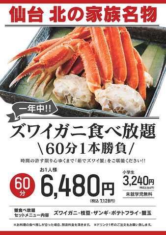 仙台北の家族名物★【茹でずわい蟹60分食べ放題7128円☆】今なら焼きずわい蟹も楽しめる♪ぜひご堪能あれ!