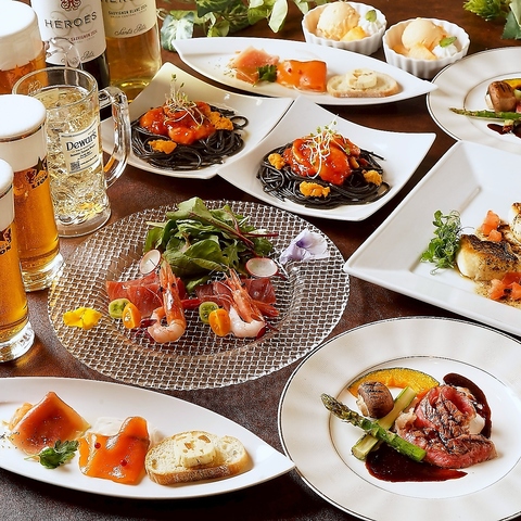 前菜3種から始まり、マグロと甘エビのカルパッチョ、真鯛のローストで魚介の旨みを堪能。メインは和牛サーロインのグリル、〆はイカ墨のスパゲティ。最後は北海道メロンジェラートまで揃う、ビヤホールの枠を超えたフルコース仕立ての贅沢プランです。※写真は2名様盛りです。