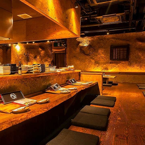 【掘りごたつ席:~4名様】店内は全席掘りごたつ席をご用意。こちらのお席の人数は最大8名様までご利用可能。雰囲気抜群の落ち着いた空間は、仲の良いご友人同士やご家族でのお食事など、幅広くご活用いただけます。洞窟をイメージしており、非日常的な雰囲気が楽しめます。いつもと違う気軽なお食事や女子会にもぴったり♪