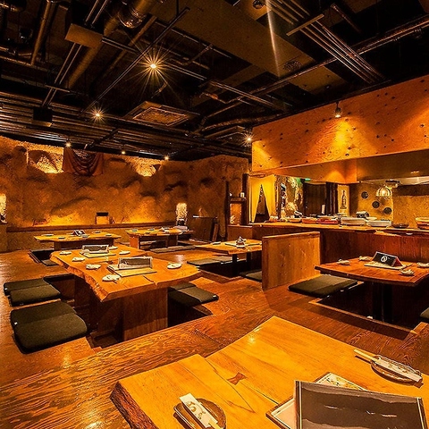 【掘りごたつ席:~18名様】店内は全席掘りごたつ席をご用意。人数は最大18名様までご利用可能。洞窟をイメージした、1フロアの広々とした空間が特徴です。掘りごたつ席なので、足を伸ばしてゆったりとお寛ぎいただけます。少人数から中規模宴会まで柔軟に幅広く対応いたしますので、まずはお気軽にご相談ください。