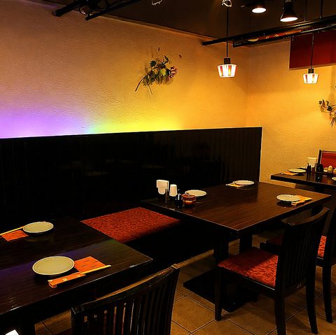 ライトが華やかな夜を演出。テーブル席中心のダイニングフロアーは、テーブルがロールカーテンで仕切られています。