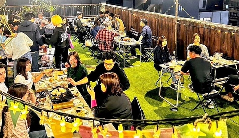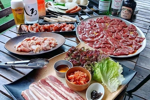 毎年大盛況のビアガーデンが営業中♪ 牛肉 ・鶏モモ・・豚のサムギョプサル・焼き野菜・ソーセージ・おにぎり・つくね団子 + 2時間飲み放題がついてます。お席は2時間30分までOK 子供は3300円