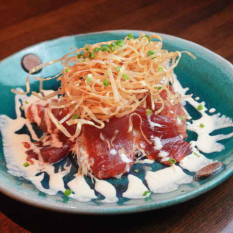 新鮮なマグロと、シャキシャキ野菜とパリパリの食感が絶妙にマッチ。特製ドレッシングが素材の旨味を引き立てる一皿は、見た目も味も楽しめる贅沢サラダです。食卓やお酒のお供にぴったり。【バー/ジャズ/飲み放題/女子会/誕生日/宇都宮】