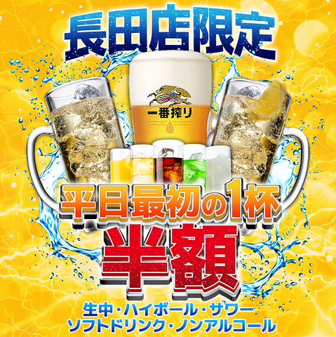 平日最初の1杯が半額に!生中・ハイボール・サワー・ソフトドリンク・ノンアルコールから選べます◎