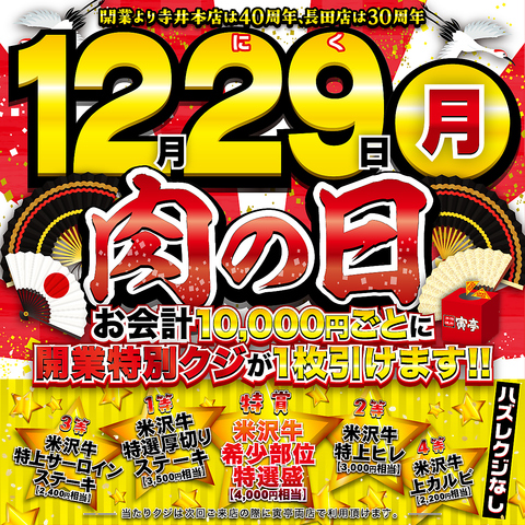 全て米沢牛が当たる豪華開業特別クジが引ける!特賞希少部位特選盛、1等特選厚切りステーキ、2等特上ヒレ、3等特上サーロインステーキ、4等上カルビ!ハズレクジなし!美味しいお肉を食べたくなったら是非当店で※お会計10,000円(税込)ごとにクジを1枚引けます!当たりクジは次回ご来店の際に寅亭両店でご利用できます。