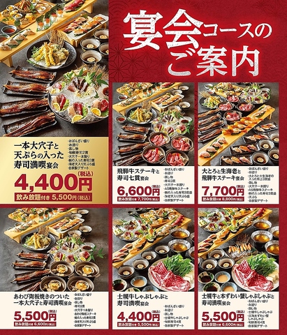 ご予算に応じて選べる宴会は税込4400円~飲み放題付宴会もござます♪2名様より前日までご予約承ります!