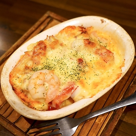 魚介をふんだんに使用したマカロニグラタンは、ひと口食べるとやみつきになる味わい。旨みたっぷりの魚介と、コクのあるクリーミーなソースが絡み合い、最後まで飽きずに楽しめます。熱々の美味しさをぜひご堪能ください。
