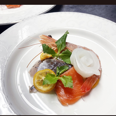 コースお料理の前菜一例となります。個室・完全予約制のコース料理をご用意しております