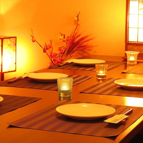 【全席完全個室でご案内。】全席安心の個室でご案内しております。特別な日のご利用にも最適です。そっと灯る間接照明に心癒されます‥。