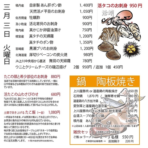 旭川は北海道の中心であるからこそ新鮮な魚介が各地から集合いたします。料理長の目利きにより厳選された旬魚介の特選お刺身盛り合わせが特に獅子豆のおすすめです。真タチ天婦羅/ポン酢や八角刺身にあんこう鍋はあと少しで終わります。ご宴ご宴会でも大好評の利尻昆布出汁使用の石狩鍋など獅子豆の自慢の各種お鍋を是非お試し下さい。