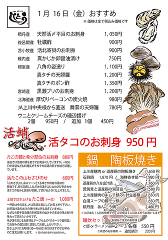 獅子豆の一番のおすすめはお刺身です。鮮度には絶対の自信有り。旬魚介も随時、本日のおすすめメニューに追加されます。