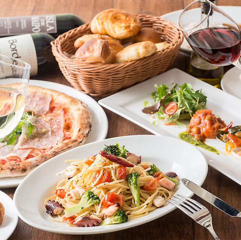 パスタ・ピッツァ・グラタン・お肉料理の中からお好きな1品をチョイス!お料理が出来上がるまで、お好きなだけ当店自慢の焼き立てパン・イタリアントマトカレーバイキング、種類豊富なドリンクバー(+264円)をお楽しみください♪もちろん食後にも甘い系の一口サイズのパンや、ホットドリンクメニューも充実★