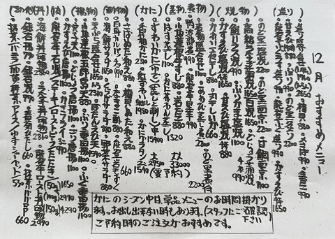 12月、1月、2月はカニ尽くし会席のみのご案内になります。仕入れ、仕込みの都合にご理解の程お願いします。(物凄いかにのご予約で手が回らなくなりました。ごめんなさい)かにシーズン中は、コース以外の単品メニューご注文に対応出来ない場合あります