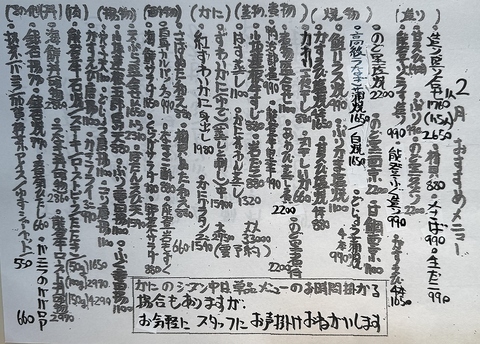 旬の味覚を贅沢に堪能するなら、毎月更新される単品メニューがおすすめです!店主が真心こめて手書きの献立でご提供しております。厳選した新鮮な食材を丁寧に調理し、素材本来の良さを最大限に引き出します。一品一品心を込め、ひと手間加えた繊細で味わい深い料理をぜひ、一度、ご賞味ください。お酒も多数ご用意◎