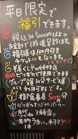 税込み5000円以上のお会計で1枚進呈致します。御食事券やビリボカオリジナルパーカーなどが当たる☆