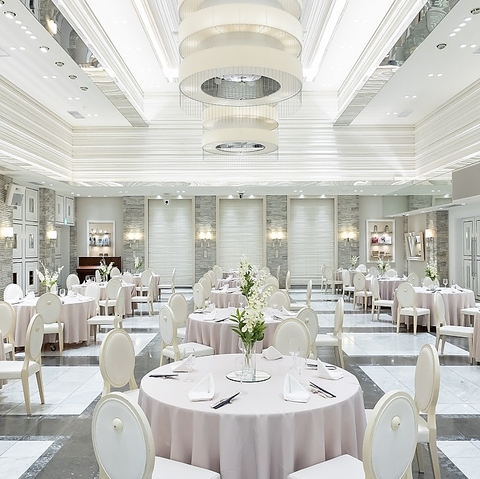白を基調としたバンケット会場です。コース料理と豊富なドリンクでご宴会におすすめ! 40名~最大120名様