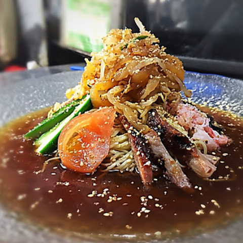 くらげ、チャーシュー、錦糸玉子、鶏肉、カニ、トマト、キュウリ、椎茸。甘っ酸っぱいしょうゆたれ。又一順特製ごましょうゆたれ