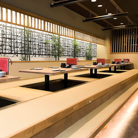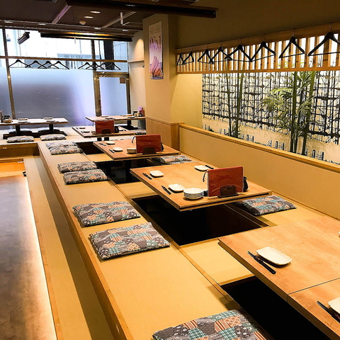 テーブルやインテリアは和の雰囲気で統一。落ち着く雰囲気の店内で、大人数の宴会はいかがでしょうか?掘りごたつ席は2~38名様の様々な人数の宴会に対応!ロールカーテン仕切りを使って半個室のような空間にすることができます。テーブル席も使った宴会は最大46名様までOK!会社の宴会や歓迎会・送別会などにもオススメ!