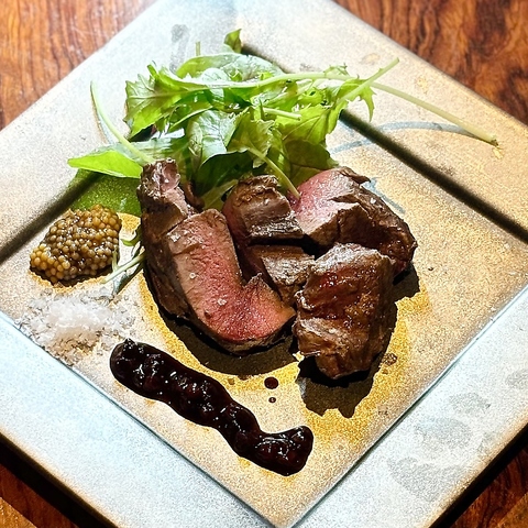 北海道白糠で伝説のハンターと呼ばれる松野さんの処理施設で厳選されたえぞ鹿肉を焼き上げています。たっぷりの肉汁で大変栄養価が高く低カロリーなスーパーフードです