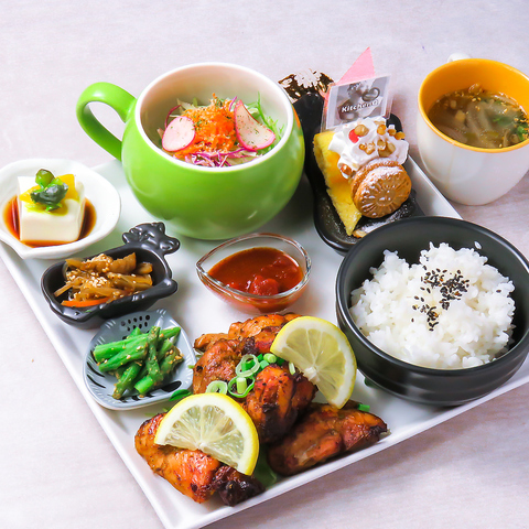 17種類のスパイス、香味野菜、ハーブをペーストにして付け込み上手に焼き上げております、スープ、サラダ、小鉢、ごはん、デザートがついています。