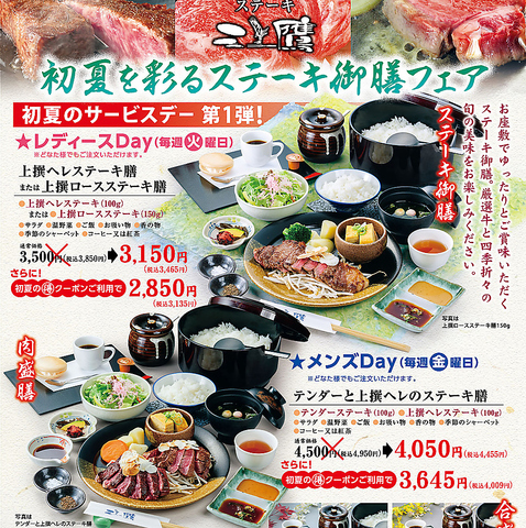 毎週火曜はレディースDay、金曜はメンズDay!人気のステーキ膳が特別価格に♪このチャンスをお見逃しなく!