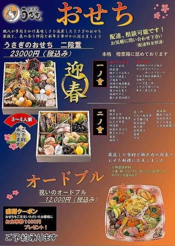 職人が手間をかけ美味しさを追求したうさぎのおせち◎【うさぎのおせち 二段重 23,000円(税込)】【祝いのオードブル 12,000円(税込)】を用意!家族・気の合う仲間と新年を華やかに迎えるためのお供に。配達の相談も可能ですので、お気軽にお問い合わせください!