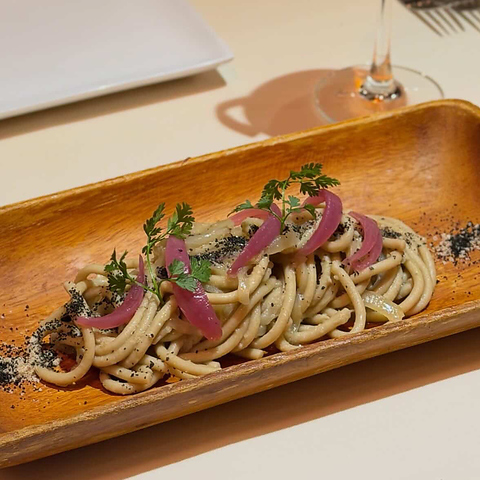 ヴェネチアを代表する郷土パスタ。そば粉を使ったもちもちの太めのパスタにアンチョビの塩味、玉ねぎの甘みを楽しめる一皿。