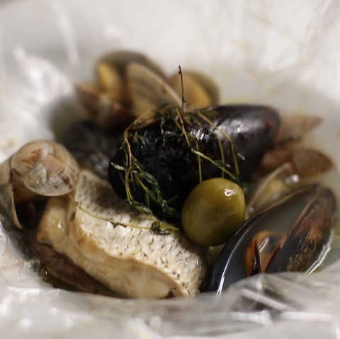 スズキ、アサリ、ムール貝とハーブの包み蒸し