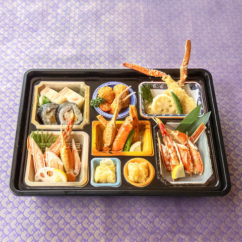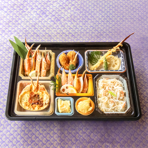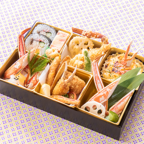 ご自宅での食事会、お祝い事でのお集りや法要などでのお食事などに、かに道楽の特製仕出し弁当をぜひご賞味下さいませ。全3種【葵(あおい)】5,400円、【紬(つむぎ)】6,480円、【雅(みやび)】9,720円とご用意しております。 ご準備にお時間頂きますので、早目のご予約をお願い致します。