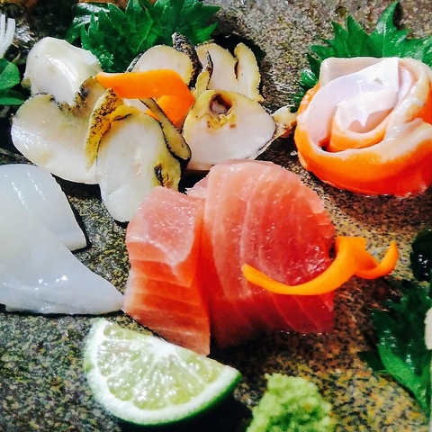 市場から仕入れた厳選された魚介類を贅沢に五種類盛り込みました!当店の一番人気メニューです。(写真は一例です。魚種は仕入れにより変わります。)