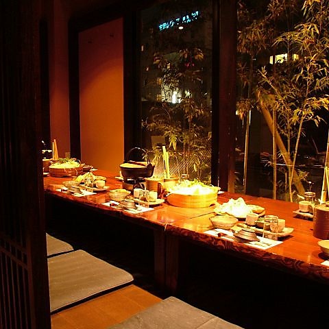 4~16名様までご利用頂ける個室の掘りごたつ席です。古い民家、酒蔵をイメージした造りで、懐かしさ溢れる自慢の空間。庭の見える落ち着いた雰囲気の掘りごたつ個室は接待に人気です。そのほかお座敷・テーブル個室も充実していますので、周りを気にせずゆったりとお食事が楽しめます