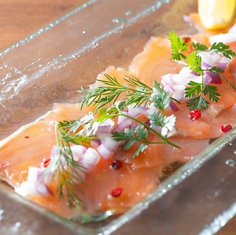 スペイン産ハモンセラーノ、US産アンガスビーフ、イベリコ豚ベーコン、北海道産フランクフルト・粗びきソーセージ・バジルソーセージ・行者にんにくソーセージなど、こだわり食材を使ったお料理!画像は、「イベリコベーコンのシーザーサラダ」(1,480円税込)、肉厚のイベリコベーコンをお好みのサイズにカットしてお召し上がりください!