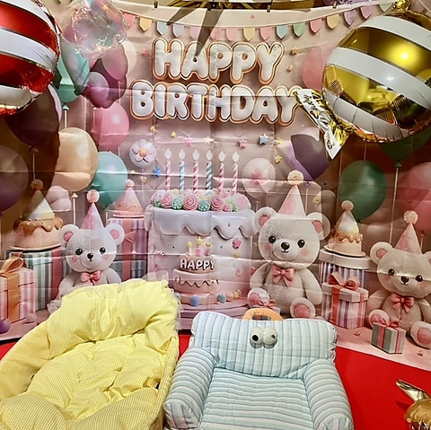 前日までの電話予約で、可愛いバースデーフォトブースをご用意。大切なペットの記念日を素敵に彩ります!
