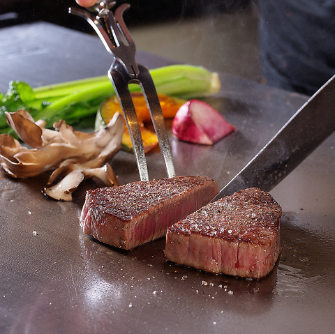 お客様の目の前で、鉄板で炎をあげ華麗に焼き上げる鉄板焼。五感で楽しむディナーを是非お楽しみ下さい♪