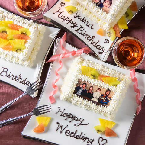 メッセージを添えたフルーツがたくさん乗ったケーキや、大人気の写真をプリントしたフォトケーキなど、主役が喜んでくれるサービスを提供しております! シーンやメンバーに合わせて対応させていただきますので、お気軽にお申し付けくださいませ★