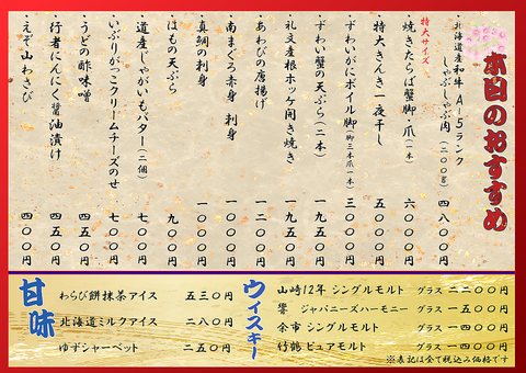料理長が作る当店自慢の本格和食料理!新鮮なお刺身や、北海道の味覚を多数ご用意しています!ぜひご賞味ください!※写真はイメージです※季節により内容は変更となります