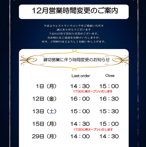 貸切営業に伴う時間変更のお知らせとなります。お客様にはご迷惑をお掛け致しますが、何卒ご理解のほどよろしくお願い申し上げます。