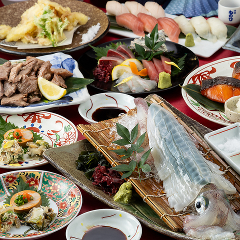 当店自慢の活きイカ姿造りをはじめ、ジューシーな牛タン葱焼きや芝海老とあんこうの唐揚げ、月見つくね焼き、〆は寿司2貫と厳選食材をふんだんに盛り込んだ大満足のコースです!忘年会や新年会、歓迎会や送別会、接待等の各種宴会から、ご友人やご親戚のお集まりまで、各種飲み会などに是非ご利用ください。